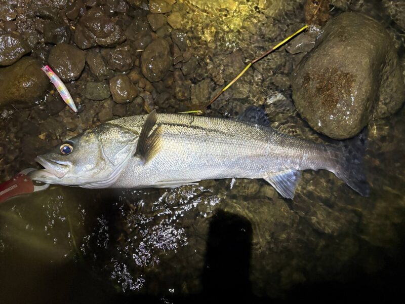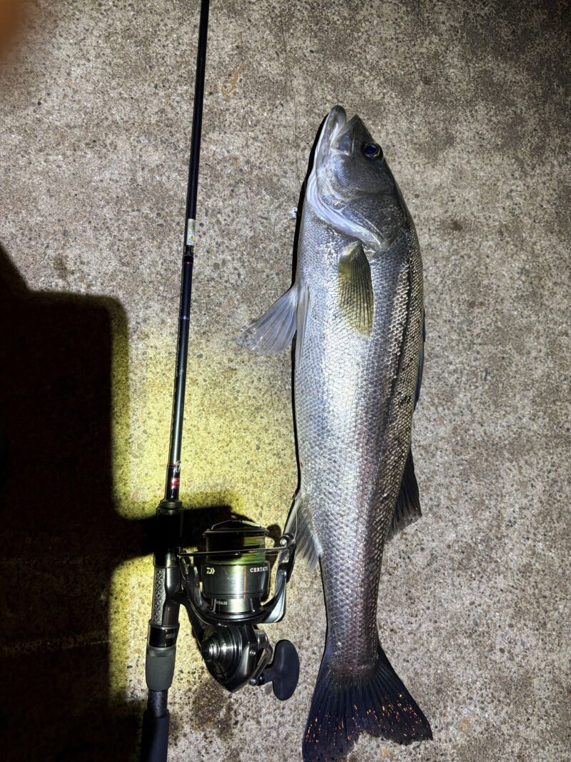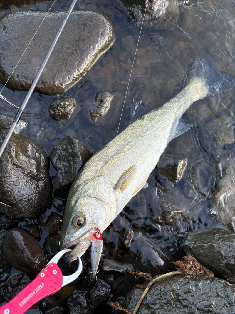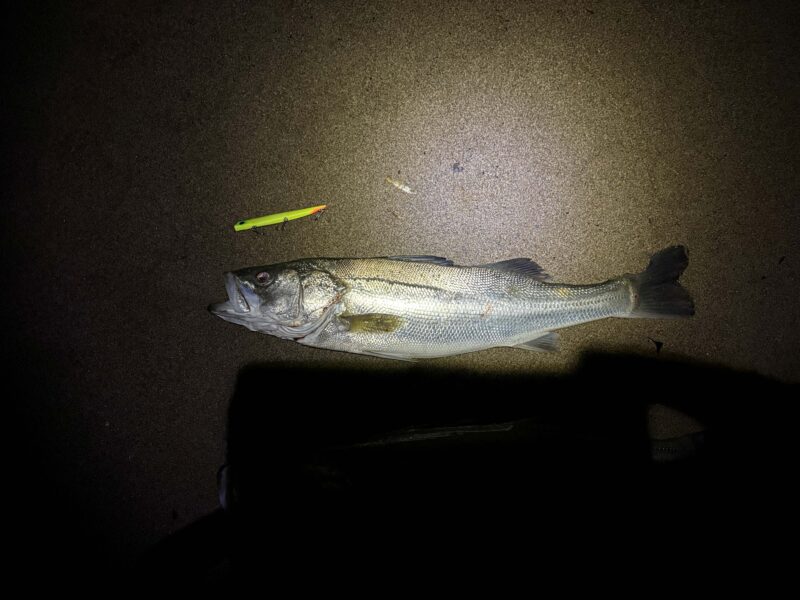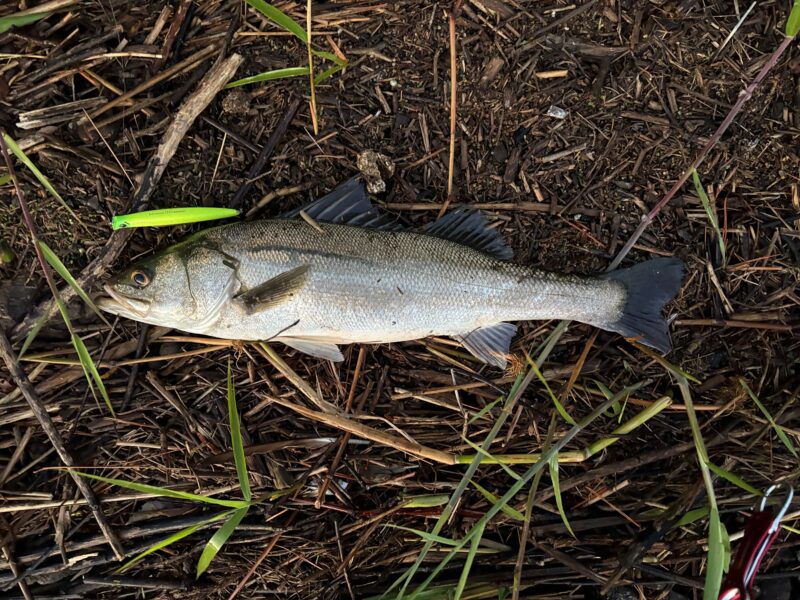 この日は、カフェオレみたいな水色の日で、いままで釣れていたドリフトのパターンではアタリがありませんでした。ちょうど久保田さんのシーバスプランニングを読んでいたので、本に書いてあった通り、巻かずに流してみようと実践してみたら「シュポッ」と吸い込むようなバイトが出てくれました。記憶に残る一本です。